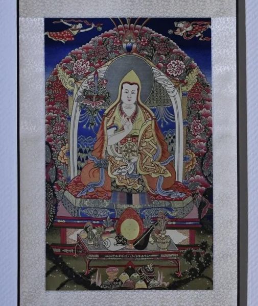 本作品的主體是藏傳佛教格魯派創(chuàng)始人宗喀巴。豐富的層次,飽滿的花紋,使其成為獨具風格的高檔全真絲宋錦唐卡。