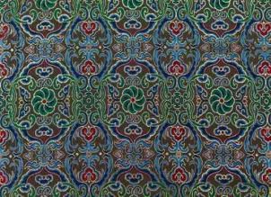 作品紋樣取材于漢、唐、宋、明、清時代的傳統(tǒng)蜀錦紋樣,采用的原料為純天然綠色纖維——染色桑蠶絲和粘膠棉漿絲。該織錦充分體現(xiàn)出蜀錦面料的色彩艷麗與富麗華貴。