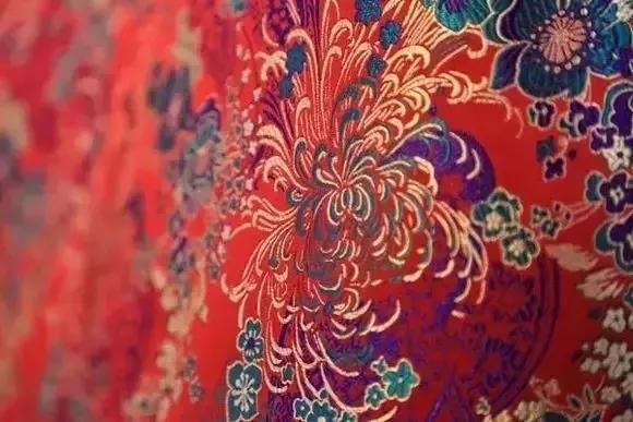 南京云錦大量使用金線,逐花異色,質地堅實,花紋渾厚優(yōu)美,色彩濃艷莊重。配色運用 “色暈 ”層層推出主花,且從云錦的不同角度觀察,繡品上花卉的色彩是不同的。