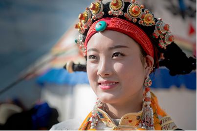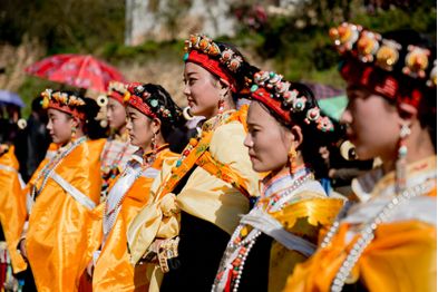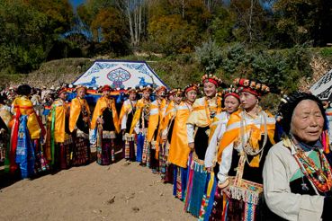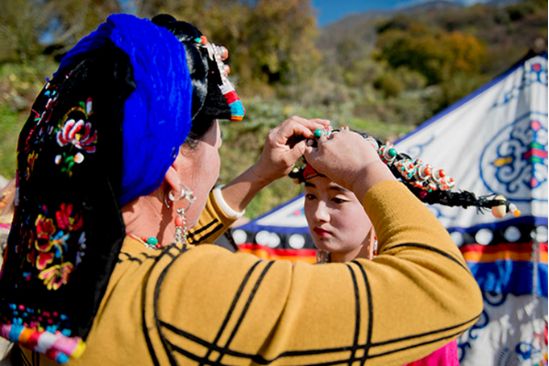 盤(pán)好發(fā)髻,佩戴好頭飾,在肩、背系好五彩哈達(dá)后,由本村具有威望的女性長(zhǎng)者引領(lǐng)來(lái)到儀式現(xiàn)場(chǎng)。法號(hào)聲中,煨桑的青煙裊裊升起,威嚴(yán)的活佛主持誦經(jīng)祈福儀式。隨后,德高望重的長(zhǎng)者為參加儀式的女子送祝福茶,長(zhǎng)輩為姑娘們獻(xiàn)哈達(dá)。一系列儀式結(jié)束后,無(wú)論男女老少,都來(lái)到場(chǎng)地中央,踏歌起舞,跳起吉祥的鍋莊。