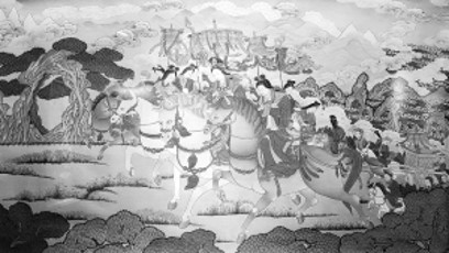 《文成公主進(jìn)藏》及其細(xì)部。規(guī)格:100厘米×60厘米,創(chuàng)作時(shí)間:1985-1993年,作者:夏吾才郎、更登達(dá)吉。這幅作品由夏吾才郎構(gòu)圖,更登達(dá)吉及徒弟上色完成。整幅作品生動(dòng)寫實(shí)、布局嚴(yán)謹(jǐn)、色彩淡雅、遠(yuǎn)近相應(yīng),呈現(xiàn)出廣泛的視覺空間。 解加馨于供圖