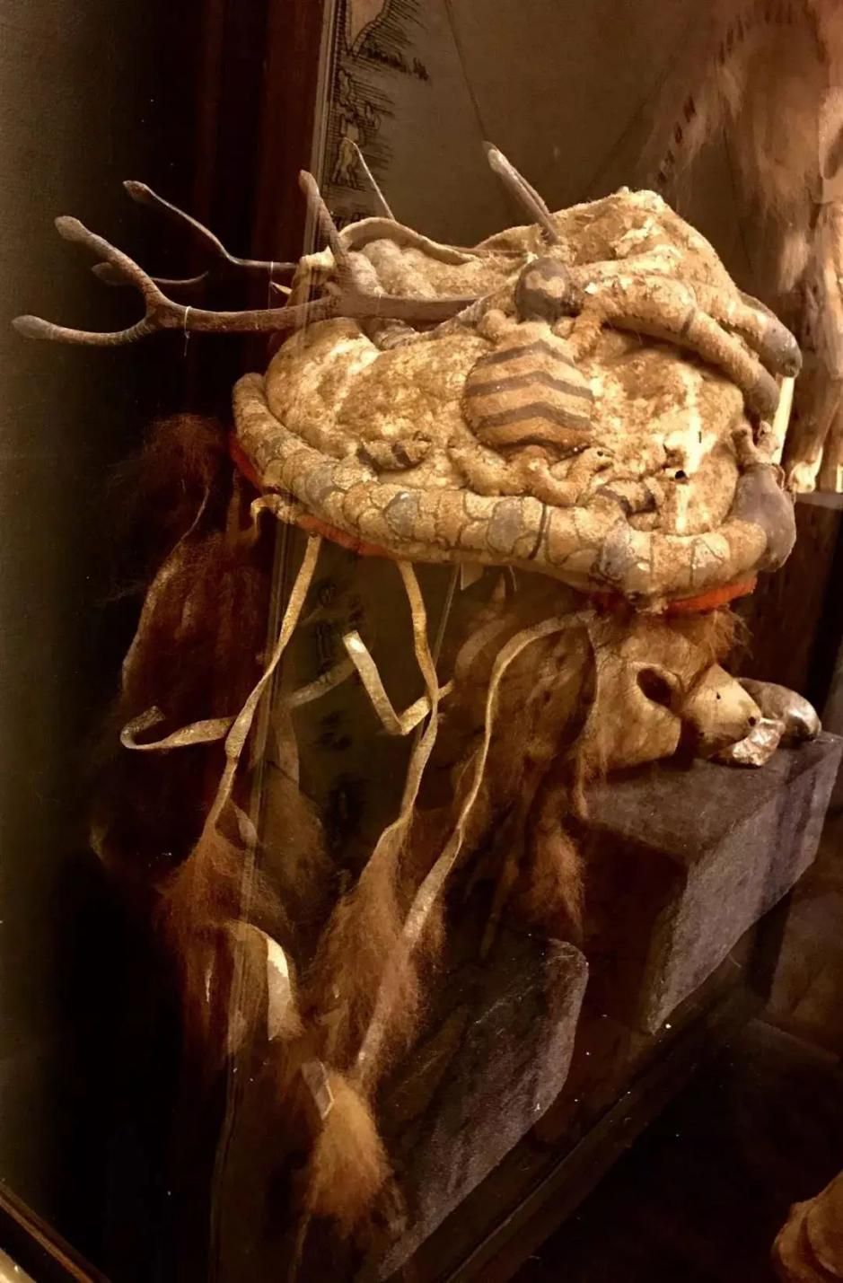 展區(qū)內(nèi)還陳列著幾套保存完整的薩滿服飾,有鹿皮、獸皮、魚皮和纖維等多種材料。與國內(nèi)留存的薩滿服飾不同的是其鹿角帽的制作,鹿角帽上裝飾著龜、蛇和神偶形象,頂端八岔鹿角的材料是金屬。