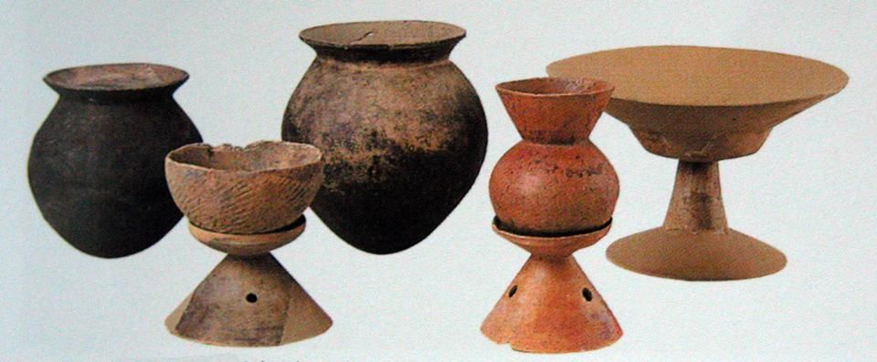 彌生時(shí)代的名稱,源自1884年東京市本鄉(xiāng)彌生町“彌生陶器”的發(fā)現(xiàn)。彌生陶器與繩紋陶器截然不同,為素面,灰色。日本人認(rèn)為彌生陶器是“渡來人”制造的。“渡來人”是中國大陸通過朝鮮半島而來,他們帶來了陶器的制作技術(shù)。彌生陶器為深釜器,以甕形器、缽形器、高腳杯(豆形器)為主(圖五)。