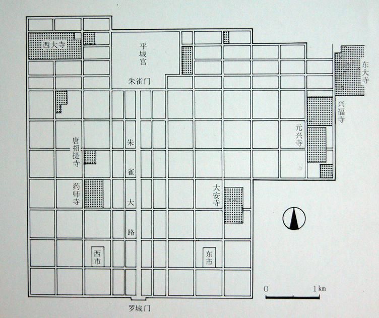 平城京在規(guī)模上繼承了藤原京,面積大致相同,東西約5.9km、南北約4.8km,其形制主要模仿唐長(zhǎng)安城。全城平而呈長(zhǎng)方形,宮城在北部中央。南面正中設(shè)象征性的都城正門——羅城門。羅城門與宮城的朱雀門相對(duì),朱雀大路縱貫?zāi)媳保L(zhǎng)約3.8km,寬72m。而此朱雀大路正好將全城分為東西兩部分,分別稱左京和右京。京城內(nèi)有里坊與商市(即東市和西市)。這些設(shè)置和街道的名稱都和唐長(zhǎng)安一模一樣,但總體面積僅為唐長(zhǎng)安城的四分之一(圖二十一)。