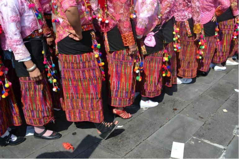 各地男子的服飾大同小異,均留短發(fā),未婚男子包一頭或兩頭鎖彩邊的白布或黑布包頭,已婚男子包藏青色布包頭。青年男子的包頭上往往插有鮮花或絨球飾。穿藍(lán)、白、黑等素色斜紋布對(duì)襟布扣袢上衣,黑色或藍(lán)色長(zhǎng)褲,系黑色綁腿。未婚婦女留長(zhǎng)發(fā)盤(pán)辮。穿白、藍(lán)色對(duì)襟銀扣上衣,黑、藍(lán)色長(zhǎng)褲。系繡花飄帶黑布裙。