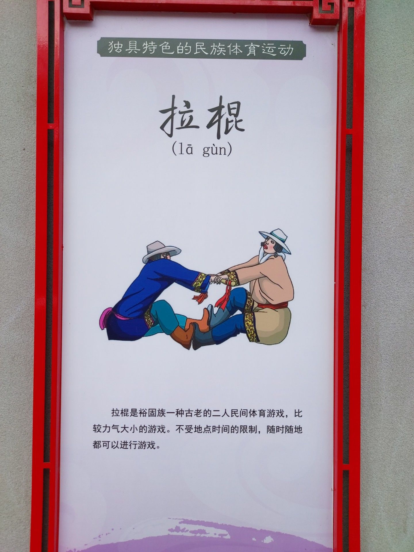 拉棍是裕固族一種古老的二 人民間體育游戲,比較力氣大小的游戲。不受地點時間的限制,隨時隨地都可以進行游戲。