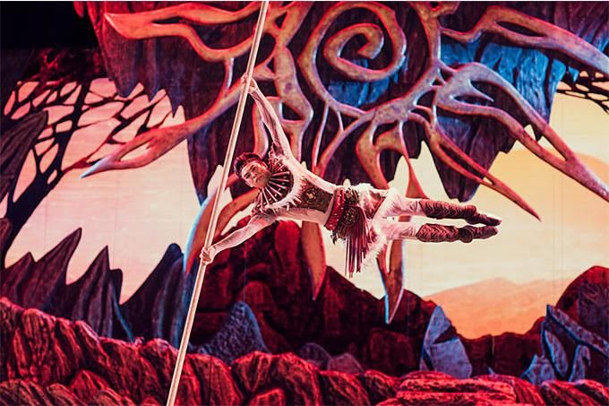 雜技藝術(shù)在劇場空間維度的呈現(xiàn),一是把身體作為一種最為本質(zhì)的符號材料進(jìn)行直接表現(xiàn);二是通過與物體、音樂、舞蹈、燈光、唱詩等的排列組合,展示技藝的身體與物體、空間的關(guān)系,達(dá)到彰顯其生命意蘊(yùn)與美學(xué)品質(zhì)的目的。劇中網(wǎng)吊、綢吊、轉(zhuǎn)動桿上技巧等項(xiàng)目非常炫技,展現(xiàn)了現(xiàn)代雜技的審美意境,詩與思在舞臺上相得益彰。綢吊極具浪漫色彩,承載著輪回與終極的生命哲理;智者的“唱詩”,凸顯了該劇的史詩特征,增加地域文化和遠(yuǎn)古歷史的厚重感。