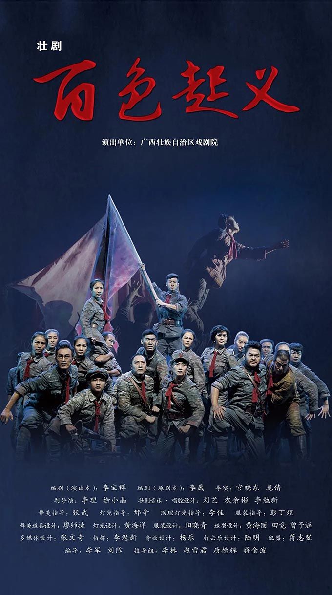 壯劇《百色起義》以1929年發(fā)生在廣西的百色起義為素材創(chuàng)作而成,以百色起義的籌備、舉行為主線,分為初到南寧、群雄聚會、英靈歌唱、百色大地等部分,通過獨(dú)具廣西特色的壯劇方式來表現(xiàn)紅色歷史題材,塑造了鄧小平、李明瑞、韋拔群等眾多百色起義指戰(zhàn)員形象,謳歌了舍生忘死、救國救民的革命先烈和為中國革命付出巨大犧牲的壯鄉(xiāng)人民。