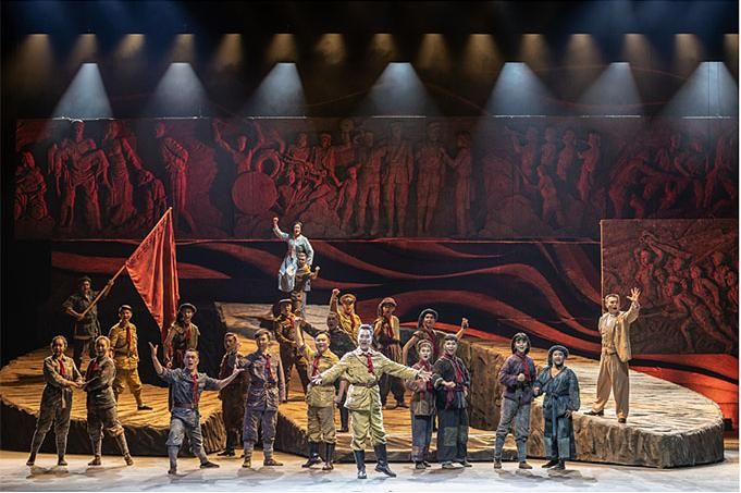 在舞蹈語言的設(shè)計(jì)上,編導(dǎo)融入當(dāng)代元素,使觀眾不但感受到審美的親切與現(xiàn)代感,而且還自然地進(jìn)入回望歷史的情境,對其思想內(nèi)涵的理解更為準(zhǔn)確。該劇的道具使用和調(diào)度也頗為大氣,令人印象深刻。一組斜坡狀的大型舞臺道具不但由群眾演員直接移動而實(shí)現(xiàn)即時的場景調(diào)度,還可使演員上下和左右而行,最終組合成巨大的中國共產(chǎn)黨黨徽,輔助完成了人民英靈和英雄的形象塑造。