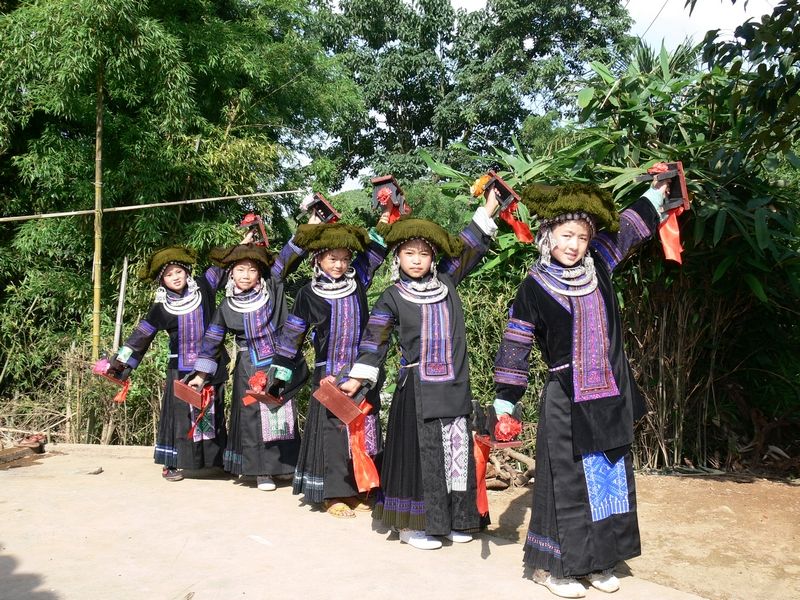 板凳舞,苗語稱:“卡牛檔”。關(guān)于它的起源,在黑苗中一直這樣流傳:相傳在很久以前,寨中的男子都參軍打仗去了,剩下老人、婦女和小孩,由于地處高山,深林密布,經(jīng)常有野獸出沒,婦女們?yōu)榱藟涯?,白天晚上都喜歡聚在一起,用小板凳互相擊打,敲出聲響,驅(qū)趕野獸……漸漸地,就慢慢演變成了在當?shù)孛缱鍕D女生小孩辦滿月時,拿小板凳敲擊舞蹈祝福小孩的習俗。