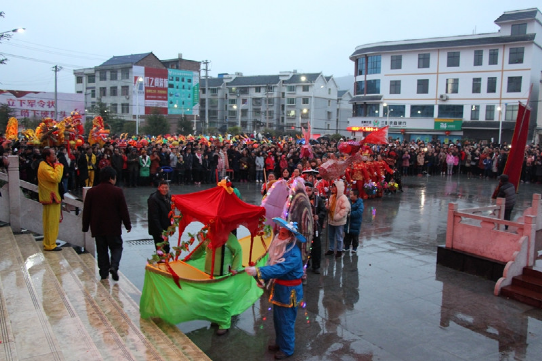 2019年2月16日農(nóng)歷正月十二是瓦寨鎮(zhèn)傳統(tǒng)大型集會活動日,舞龍為主要活動之一。午飯后,來自全縣各地的舞龍舞獅隊(duì)、花燈隊(duì)陸續(xù)到瓦寨政府廣場集結(jié),并在廣場右側(cè)有序排隊(duì)等待,各隊(duì)隊(duì)員精神抖擻、神采飛揚(yáng)、迫不及待。前來參觀元宵舞龍的群眾和游客也不斷涌向廣場,大街小巷行人猶如潮涌,吆喝聲、歡笑聲、鑼鼓聲連綿不斷……下午五時許,活動在瓦寨鎮(zhèn)政府廣場正式開始,先是由鎮(zhèn)領(lǐng)導(dǎo)對脫貧攻堅(jiān)各項(xiàng)惠民政策及5年來瓦寨取得的攻堅(jiān)戰(zhàn)績進(jìn)行宣講,宣講慳鏘有力、扣人心弦,特別是5年來瓦寨取得的攻堅(jiān)戰(zhàn)績,一致得到人民群眾好評和認(rèn)可。隨后,舞龍、舞獅、花燈表演紛紛上演,只見黃龍時而上下翻騰,時而昂首擺尾,雄獅時而就地打滾,時而賣萌撒嬌,樣子憨態(tài)可掬,花燈表演幽默滑稽,在前行中跑出各種套路,起伏波動、生動活潑,吸引了所有人的目光,贏得了陣陣喝彩……