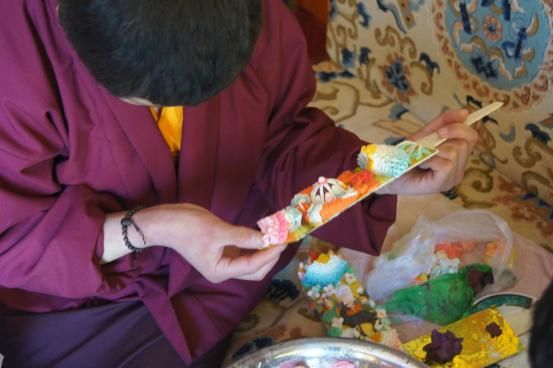 酥油花是藏族傳統(tǒng)工藝的古老藝術之一,又稱油塑藝術,是以酥油為材料而制成的特殊雕塑作品。每年冬天,由手工藝人們將酥油切成薄片,加上冷水,攪拌均勻,加入各種礦物顏料后雕塑而成。每年藏歷新年的一月十五日都會舉行盛大的酥油花藝術作品展覽活動。