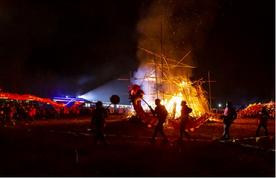更具特色的要數(shù)正月十五趕毛狗子了。傳說毛狗子(狐貍的俗稱)喜歡偷雞吃,所以必須得趕走。趕毛狗這一天,親朋好友聚在一起,先用竹筒做成火把或用木梓油做成燈備用,再砍樹枝搭成棚子,放入草扎的毛狗子,堆放未破節(jié)的竹筒和火炮樹葉。待天黑,男女老少全部出動,在屋邊及路邊插上點(diǎn)燃的火把、燈,然后燒燃毛狗棚,這邊的人群發(fā)出“哦嗬”聲,那邊的人群高喊“趕毛狗子喲!”此時,滿山遍野火光沖天,叫喊聲此起彼伏,震耳欲聾,熱鬧非凡。