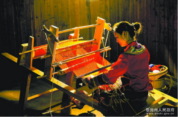 土家織錦歷史悠久,源遠流長。從秦至西漢,土家先民的紡織業(yè)逐漸發(fā)展,所織的“布”已成為納貢之名品。到元明清時期,“西蘭卡普”已被稱為“土錦”“花布”,并大量用于服飾,《大明一統(tǒng)志》載:“土民喜服五色斑衣”;清同治本《來鳳縣志》也有關(guān)于“西蘭卡普”的記載:“……染各色棉紗為經(jīng)緯,斑然可愛”。