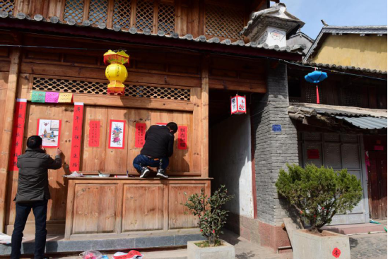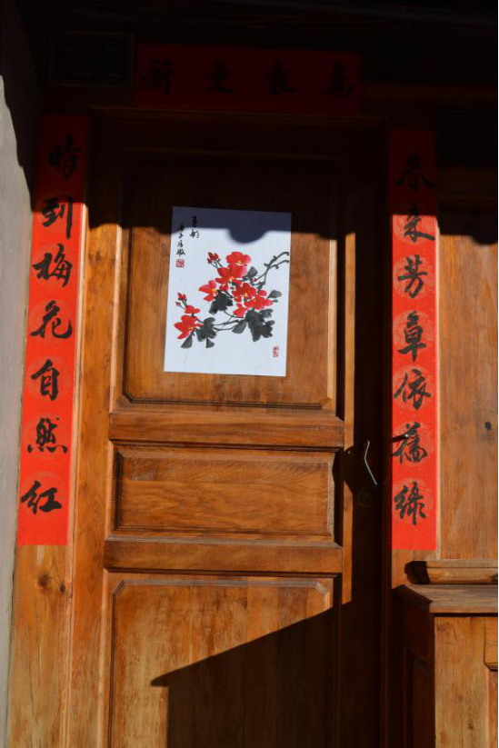 寫春聯(lián)繪年畫的傳統(tǒng)在劍川縣金華鎮(zhèn)由來已久,明朝洪武年間改土歸流和移民屯邊制度的推行,使儒家文化、理學(xué)思想逐漸融入邊疆人民的生活。金華古鎮(zhèn)居民受此影響,走上追求仕途功名的道路,文人鄉(xiāng)紳都以顯示儒學(xué)身份為榮。每逢春節(jié),人們會邀請有功名的仕子或傳學(xué)明經(jīng)的文人來到家中,撰寫對聯(lián),同時根據(jù)時令畫上一兩幅門神畫,希望通過此舉祈愿自家后生求得功名。如今走在金華古鎮(zhèn)西門街上,仍能看到家家種花養(yǎng)草,戶戶楹聯(lián)盈門,一派文風(fēng)蔚然的生機(jī)。