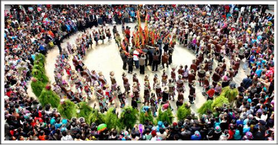 蘆笙踩堂開始時,首先舉行開堂儀式,向蘆笙柱祭祀。蘆笙柱是苗族的圣物,用高達(dá)10米以上的完整杉木制作而成,柱頂立一只錦雞(苗族崇拜的一種鳥),雞頭向東,寓意吉祥;柱身盤著一條金龍,體現(xiàn)苗族與漢族的文化融合;還有苗族崇拜的牛角和十字架。寨老和蘆笙頭分別敬上三杯酒和燒三柱香,感謝神靈和祖宗保佑,祈求坡會成功、新年萬事如意。緊接著,蘆笙頭拿起小蘆笙,圍繞一個曲調(diào)反復(fù)吹三遍,拉開蘆笙踩堂表演的序幕。