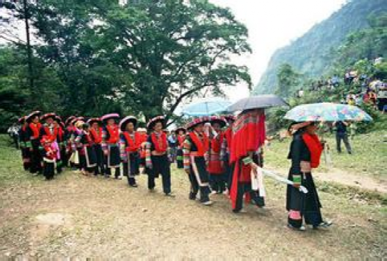 這里的"女婚男嫁"特點(diǎn),大體上有這么幾個(gè)階段。當(dāng)男女青年都長到18歲后,就開始講究修飾,喬裝打扮一新,女青年似花蕊朵朵,男青年個(gè)個(gè)英俊瀟灑。通過趕街、走親訪友、耍老表、節(jié)假日唱山歌,打陀螺,拋毽子等方式,進(jìn)行談情說愛,互相了解,這是認(rèn)識階段。在認(rèn)識基礎(chǔ)上,雙方互請到家做客,彼此進(jìn)一步掌握對方為人、性格,家庭成員,家庭經(jīng)濟(jì)等情況。這是加深認(rèn)識、了解、建立愛慕之情階段。每逢農(nóng)忙季節(jié)和節(jié)假日,女方總要請男方來幫助犁地、耙田,耕種,收割,蓋房子等,這是考察對方勤勞能干還是好逸惡勞階段,是最關(guān)鍵的階段經(jīng)過一兩年的交往接觸,雙方產(chǎn)生了深厚感情,女方就偷偷買布,精心地打好精致的布鞋送給男方,男方收到信物后,就選擇買手鐲、頭簪、戒指,耳環(huán)或手表等其中的一兩件送給女方,彼此作為定情物,確定自己的心上人。但是,這些交往仍然是在秘密的條件下進(jìn)行,屬保密階段。經(jīng)過以上四個(gè)階段以后,女方便請男方派老人帶上幾斤酒,糖,一些煙餅等禮品來訂親,要求上門,將婚事公布于眾,從這以后,女方就負(fù)責(zé)籌備一切嫁妝、床上用品、家具等。待東西備齊,女方就擇日接男方過門。