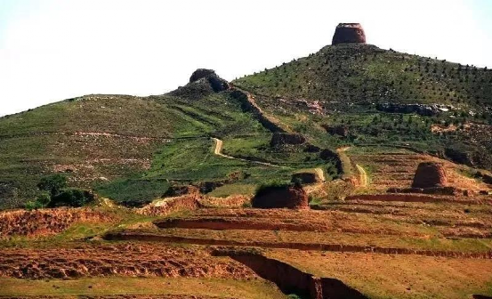 小元岇長(zhǎng)城比北堡川高200∽300米,山川之間是為寬緩慢坡,今可驅(qū)車直達(dá)長(zhǎng)城頂上。這對(duì)于當(dāng)年善于馳騁野戰(zhàn)的胡騎形不成特別的阻礙,因此這里的長(zhǎng)城防御布置的相當(dāng)密集。站在海拔1650米高的馬頭山墩臺(tái)遠(yuǎn)眺,長(zhǎng)城墻體縱橫交錯(cuò)曲折環(huán)互,蜿蜒于山脊,迷離若龍蛇橫臥。烽堠墩臺(tái)林立,密密如點(diǎn)棋局,灑鋪于群山之間。馬頭山墩臺(tái)坐落于最高峰,腳下群山連綿,長(zhǎng)城墩臺(tái)盡收眼底。長(zhǎng)城內(nèi)側(cè)有一民堡,因靠近小元峁村稱小元岇堡,此堡應(yīng)為文獻(xiàn)所載好漢山堡,由兵使盧友竹筑于崇禎五年,是為加強(qiáng)視遠(yuǎn)隘口而筑的防御軍堡。