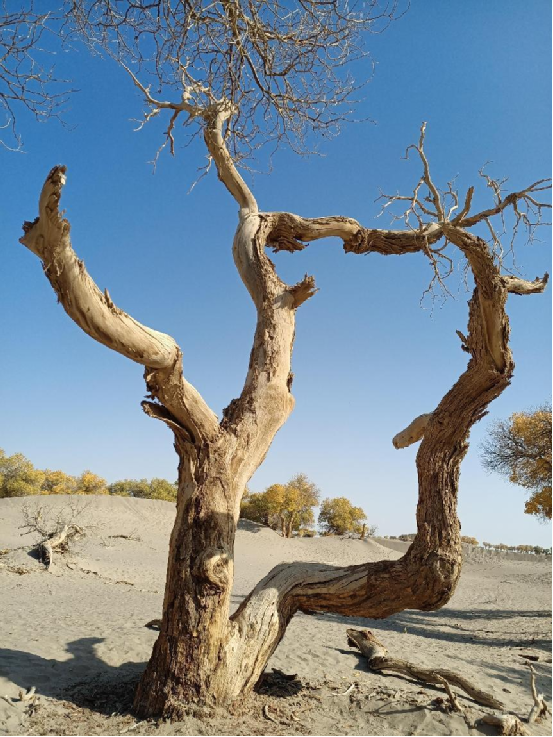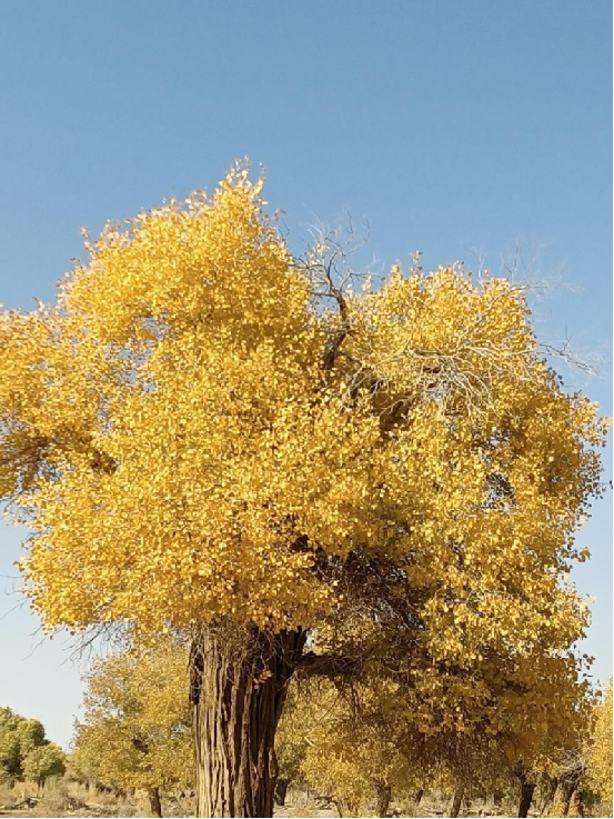 每當(dāng)深秋季節(jié),胡楊樹葉變得一片金黃,形成胡楊秋色,樹影婆娑,奇妙絕倫,賞心悅目。漫步在濃郁的胡楊林中仿佛進(jìn)入神話般的仙境。茂密的胡楊千奇百怪,神態(tài)萬般。粗壯的幾人難以合抱,挺拔的七、八丈之高,怪異的似蒼龍騰越,似虬蟠狂舞,令人驚奇不已,嘆為觀止。僅就密密匝匝的樹葉,也是風(fēng)采獨(dú)有。幼小的胡楊,葉片狹長而細(xì)小,宛若少女嫵媚的柳眉,人們常常把它誤認(rèn)為柳樹;壯齡的胡楊,葉片又變成卵形、闊卵形或三角形,猶如興安嶺的白樺;進(jìn)入老年期的胡楊,葉片才定型為橢圓形。更令人稱奇者,在同一棵胡楊樹冠的上下層次,還長著不同形狀的葉片,因此,又稱“異葉楊”