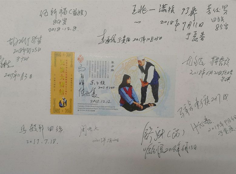 在采集口述影像錄音資料的同時,項目組還收集了大量的珍貴歷史照片以及相關(guān)文物。值得一提的是,他們設計了一種非常有特色的受訪者簽名簿,中間貼著繪有56個民族的音樂舞蹈圖案的首日封或明信片,四周簽上受訪者的人名簽名字、民族特征,有些還用民族文字書寫,體現(xiàn)了中華各民族團結(jié)在一起的精神風貌。簽名簿有厚厚的幾大本,設計精美,承載著民族工作口述史資源采集的經(jīng)歷,具有豐富的文化內(nèi)涵和博物館收藏價值。