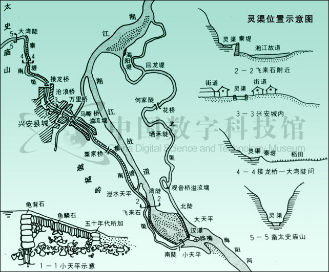 靈渠,又名零渠。以其曾部分利用靈(零)河水系的原有河道,故名。因開鑿于秦,一名秦鑿渠。又因位于今廣西興安縣城附近,故近代或稱之為興安運河。靈渠是一條連接湘江與漓江的人工渠道,主要由鏵嘴、大小天平石堤、南渠和北渠等工程構(gòu)成。鏵嘴是修建在湘江中的分水壩,用巨石疊砌而成,前銳后鈍,形似犁鏵,這是引湘入漓的關鍵工程,它有效地使湘江一分為二,一支順南渠入漓江,一支沿北渠回流入湘江。南、北渠總長三十四公里,是靈渠的主體結(jié)構(gòu),是貫穿湘、漓二水的通道。在鏵嘴尾端還筑有“∧”字的大小天平石堤,起著蓄水、溢洪,調(diào)劑水量的作用,能保證整個工程發(fā)揮正常的效益。