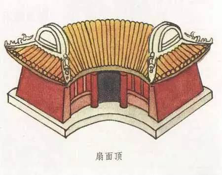 扇面頂和萬(wàn)字頂一樣,是一種非常別致的屋頂形式,扇面頂顧名思義,就是扇面形狀的屋頂形式,其最大特點(diǎn)就是前后檐線呈弧形,弧線一般是前短后長(zhǎng),即建筑的后檐大于前檐。建筑的西山墻的墻線若向內(nèi)延伸,可以交于一點(diǎn),而這一點(diǎn)就是扇形的扇子柄端。扇面頂?shù)膬啥丝梢宰龀尚?、懸山,也可做成卷棚形式。扇面頂一般都用在形體較小的建筑中,會(huì)讓建筑看起來(lái)更為小巧可愛(ài)。