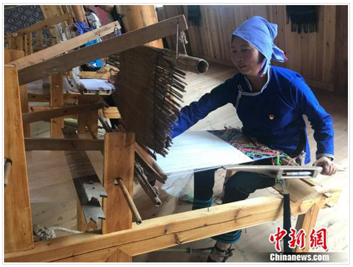 聽聞姐姐在這里織錦每月可拿到3000多元的收入,今年7月,此前在廣東務(wù)工的文坡村二組村民龍練霞干起了這份家門口的工作,再也不想外出了?!凹确奖阏疹櫦胰?,又可以抽空干點(diǎn)農(nóng)事?!苯衲?0多歲的龍練霞說。和她一樣,看到侗錦的銷路慢慢打開了,村里許多在外務(wù)工的年輕人也紛紛返鄉(xiāng),拾起祖輩們的老手藝。