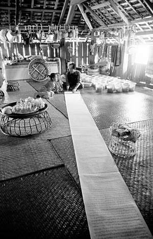 這時,走來一個大佛爺和兩個老人,因為佛祖不會開口說話,他們是來替佛祖給玉波念“薩拉帥”祝詞的。先由大佛爺念了一段《祝福經(jīng)》,給玉波滴了水,然后兩個老人打開玉波那寬半尺、長足有7米多的“薩拉帥”祝詞。玉金說,這祝詞是請曼降村的前大佛爺康朗寫的(康朗:指佛爺還俗的人)。來倆個老人念,是考慮到可以換著念。玉波的奶奶也想到了玉波可能跪不習慣,就帶來了墊子,讓玉波或跪或坐,因為念完祝詞要兩三個小時。祝詞的內(nèi)容大致是這樣的:“我是一個在菩提樹下長大的女孩,在佛祖的護蔭下,臉長得像菩提樹葉一樣又嫩又青,身材像檳榔樹一樣苗條好看,心像金鹿一樣善良。當我年滿12歲以后,人世間的喜樂情愛,貧窮苦難就會來到我的面前。今天在父母的幫助下,我準備了這些物品來賧給佛祖。我千祈禱萬祈求,希望佛祖保佑我織布是行家,丈夫種田是能手。命里見火能親,遇水能溶。生的孩子女的長得像一只蜜蜂,男的長得像一頭水牛,用他們的勤勞贍養(yǎng)雙親。從小就聽話,自幼就很乖。在母親的懷里不亂哭,在父親的背上不亂搓……”