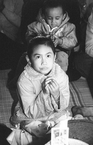 凌晨5點,我同玉波一起被她的家人叫醒,這是我一再叮囑的,要參加賧的全過程。而玉波卻揉著睡眼惺忪的眼睛哭了起來,嘴里叫著“嗨暖、嗨暖”(想睡覺、想睡覺),顯然是為打擾了她的好覺而不高興。但她今天不能不去,今天她家是專為她賧“薩拉帥”,她是主角。母親玉金不管她哭不哭,拉著她的手就走。