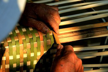 傣族竹編工藝是傣族的傳統(tǒng)工藝美術形式,歷史悠久,造型古樸,美觀實用。由于我國傣族主要聚居在云南等地的熱帶、亞熱帶地區(qū),居住地周圍多與竹子為伴,在生產生活中就地取材,形成了傣族世代相傳的主編技藝,具有著鮮明的民族特色。傣族竹編選材主要采用藤竹、粘竹、大黃竹以及巨龍竹等編織,將竹絲、篾片挑壓交織,被挑壓的篾為“經”,編織的篾為“緯”,由經與緯的挑壓可以編織出千變萬化的圖案,從而制作出千姿百態(tài)的竹編產品。代價的村村寨寨都掩映在竹林翠色之中,住的是竹樓,用的是各式自編的竹器,大至床、桌、柜、席,小至帽、盒、籃、簍,無一不為竹編。精美的竹編不僅是傣族人民的日常用品和生產工具,更是傣族人民生活藝術的外在表現(xiàn),它已與傣族人民融為一體,已經成為傣族最重要的民族文化載體和文化傳播的媒介。