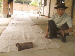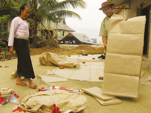 巖妞說,制作孔明燈最主要的材料是傣族的棉紙和竹編。棉紙來源于木棉樹。傣家人摘取木棉樹的樹葉并用牛油來煎熬,使之變?yōu)榘蛋咨臐{汁,待熬熟之后便拿到河邊沖洗,把其中的灰塵和沙粒洗凈。隨后,將洗凈的木棉樹漿汁攤均勻后在陽光下曝曬,曬干后便能拿來制作孔明燈了。一般的紙很容易被燒壞,而這種手工制作的棉紙韌性好,不容易撕裂和燒壞。