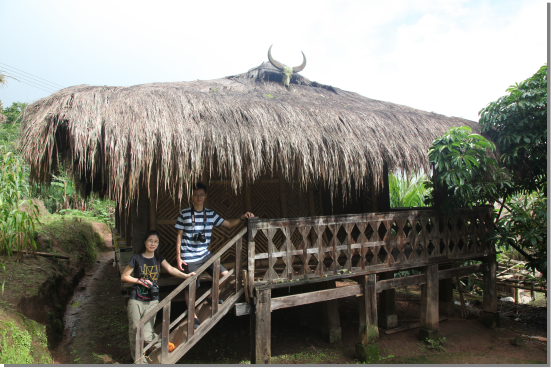 普通房子:房子內(nèi)部隔做兩間(主間與客間)。在客間的西端開—“鬼門”,連接鬼門的外邊一般都架置一個掌子(用竹子和木料搭成的七、八平米的涼臺),有的在房子左邊靠客門外架一個掌子,用途是曬晾糧食、衣物,或堆放雜物等,白天婦女還可以在上面做針線活。房子的前廈是放置牛頭或推集糧食的地方,后廈下面喂豬、雞和放杵碓。房子右邊開有一道“火門”,在“火門”右前方栽有牛角叉,左邊栽有牛尾巴樁。
