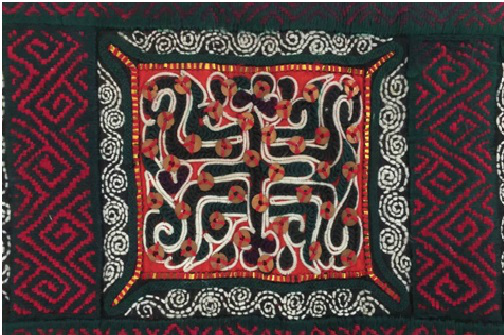背兒帶上端的背帶手上繡有連續(xù)的螺絲紋。水族是南方的稻作民族,而螺螄是水田中常見的動(dòng)物,其繁殖屬性為多產(chǎn)。心靈手巧的水族女性將日常生活中的動(dòng)物形象,經(jīng)抽象變形而變成簡(jiǎn)練的紋樣,象征著生命的不斷繁衍。