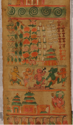 納西族東巴教的長幅布卷畫,通稱為“神路圖”,它是東巴教繪畫中的巨作。此類畫一般長10-20米,寬1尺左右,有“古代宗教繪畫第一長卷”之譽(yù)。文化內(nèi)涵異常豐富,在國際學(xué)術(shù)界被視為宗教繪畫一絕。如今,此畫已成稀有之物。很少見到尚留存民間的神路圖了?!吧衤贰敝鉃闁|巴為死者評(píng)斷、指點(diǎn)通往神地之路,把他們從地獄的煎熬中解脫超度出來,轉(zhuǎn)生為人,送至神靈之地。在納西族的喪葬和超度亡靈儀式上,根據(jù)神路圖導(dǎo)引死者靈魂進(jìn)入新的生命場是一件極為重要的大事。到時(shí),要把神路圖展開,眾東巴站于圖旁依次詠誦8冊(cè)《神路圖經(jīng)》,為死者評(píng)斷路徑,導(dǎo)引亡靈穿越鬼地;擺脫惡鬼的種種折磨。在納西族實(shí)行傳統(tǒng)安葬習(xí)俗時(shí),要在安葬場鋪開神路圖,把圖上的鬼地部分朝著死者頭部,向東北方向鋪開。往東北方向鋪的意思是死者靈魂將回歸東北方向的納西遠(yuǎn)祖之地。把死者靈魂送到“祖先之地”是納西族的古代民俗。各地納西族都有十分詳細(xì)的送魂路線,靈魂返祖地必經(jīng)的每一個(gè)地名都在口傳和寫于東巴經(jīng)的送魂路線中標(biāo)出。其畫面所繪鬼神人三界有數(shù)百個(gè)人神鬼獸的形象和很多具有宗教象征意義的物象,有佛像、神像、各種動(dòng)物神,七八十個(gè)奇禽異獸以及東巴跳神的舞蹈布局,畫卷內(nèi)容以靈魂不滅,因果報(bào)應(yīng),生死輪回等佛教信條為指導(dǎo),用連續(xù)性和富有戲劇性的畫面表現(xiàn)人死后亡魂不滅。