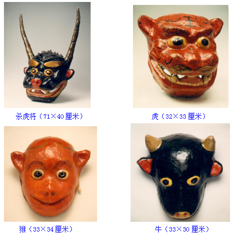 面具,土族語(yǔ)稱“面古子”,是土族在表演某些儀式舞蹈時(shí)用以表現(xiàn)一定內(nèi)涵的道具。按形制可分為假面和假頭兩大類。其中最具代表性的當(dāng)屬“納頓”節(jié)日當(dāng)中使用的面具。民族文化宮博物館珍藏了三組土族“納頓”面具,分別為表演“莊稼其”時(shí)的公公、婆婆、兒子、媳婦的假面面具;表演“殺虎將”時(shí)的殺虎將、虎、猴、牛的假面、假頭面具;表演三國(guó)演義人物關(guān)羽、張飛、曹操、呂布的假面面具。面具材質(zhì)均為布胎, 20世紀(jì)80年代征集于青海省海東市民和回族土族自治縣。