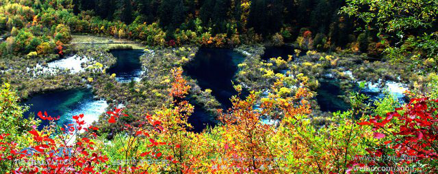 九寨溝四周群山聳峙,有雪峰數(shù)十座,高插云霄,終年白雪皚皚。河谷地帶奇水薈萃,其間有成梯形分布的大小湖泊114個(gè),瀑布群17個(gè),鈣華灘流5處,泉水47眼,湍流11段,以1870米的海撥高差,在12 座雪峰之間穿林跨谷,珠連玉接,呈Y字型串珠,逶迤近60公里,形成了中國唯一、世界罕見的以高山湖泊群和瀑布群以及鈣華灘流為主體的風(fēng)景名勝區(qū)。湖泊小者數(shù)平方米,最大的長海長達(dá)7公里。湖水終年碧藍(lán)澄澈,色彩斑讕,在陽光照射下,呈現(xiàn)出藍(lán)、黃、橙、綠等多種色彩,絢麗奪目。天氣晴朗時(shí),藍(lán)天、白云、雪山、森林倒映湖中,水光浮翠,美麗如畫,并隨季節(jié)推移呈現(xiàn)出不同的色彩和風(fēng)韻,有“九寨歸來不看水”之說。