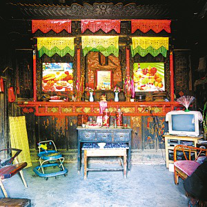 隴川縣戶撒鄉(xiāng)曼旦寨是阿昌族古老的村寨之一,明、清時(shí)期的老宅皆以楠木建造,數(shù)百年不朽、無(wú)蟲(chóng)蛀。受漢族文化影響,傳統(tǒng)民居大都是土木石結(jié)構(gòu)的三合一照壁或四合院落。正房建在長(zhǎng)方石條加土方壘起的屋基上,屋基下為院壩,以三層石階上下。正房三開(kāi)間,四排五柱,中柱起脊,形成雙斜面屋頂,上覆凹型青瓦。后墻和兩側(cè)山墻以土坯砌筑,外面不抹泥,左右是廂房或照壁。室內(nèi)隔墻均為木板,中間一間為堂屋,有一米多寬的吞口,六扇雕刻的木板門,平時(shí)只開(kāi)中間兩扇。兩邊的檐柱頭有粗獷的木雕。吞口有走廊的作用,一般左側(cè)角設(shè)臉盆架以供洗漱,板壁上掛小鏡框以便梳妝,旁邊掛著家人的照片。有的擺著縫紉機(jī),有的放藤椅小憩。右側(cè)放臨時(shí)的農(nóng)具,掛衣服,板壁上貼著影視明星的招貼畫(huà)。堂屋正面板壁是通高的木雕佛龕,供奉佛像和傣文的經(jīng)文,龕楣上貼著三至四層掛錢,下面有燭臺(tái)、香爐。左側(cè)擺著電視機(jī)、熱水瓶、茶桌,板壁上掛著戶撒刀和手工編織的背兜,右側(cè)有專供老人休息的床或藤椅,也有的砌火塘,火塘的小土臺(tái)上放著炒菜的調(diào)料、火柴和照明燈具。