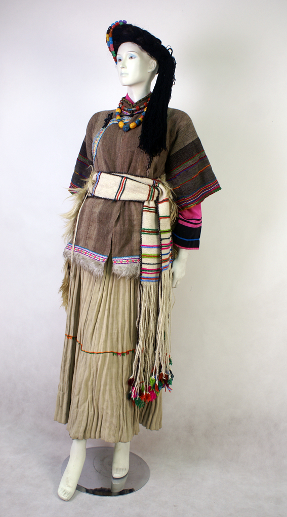 普米族婦女的上衣為黑色、蘭色、白色的開(kāi)襟短衣,和男子基本一樣,但袖口有花邊,領(lǐng)口用花線繡上吉祥的圖案。下身著百褶筒裙,裙腳邊加一圈紅線,裙襠口加一圈白色厚布,裙腳寬大,縫成褶皺形狀,一般需布匹二丈多。腰間系一根彩帶,彩帶多用山麻或羊毛捻線織成。日常生產(chǎn)生活中,普米族婦女喜歡穿羊皮褂,皮褂有兩種,一種是有袖子的開(kāi)衫皮褂,一種是不作任何加工縫制的披肩皮褂,一般多用披肩皮褂。青年婦女均穿短上衣,古代是用麻制的,現(xiàn)代大多用棉布;過(guò)去多喜歡白色,現(xiàn)在喜用白黑紅等多種顏色;右面開(kāi)襟,下襟較短,窄袖高領(lǐng)。春天她們穿用條絨縫制、領(lǐng)和衣邊鑲嵌金銀邊的夾衣,稱金邊衣服。