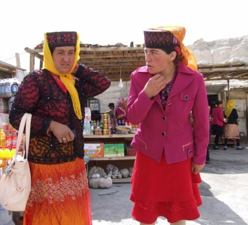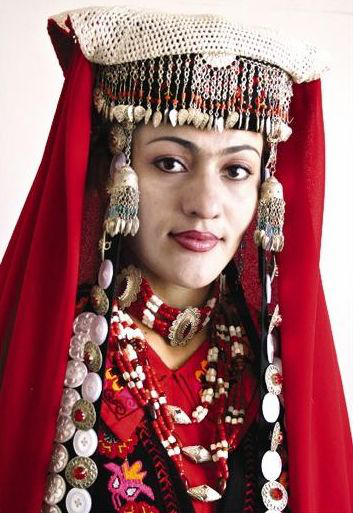 塔吉克族女子愛戴首飾,最引人注目的要數(shù)新郎和新娘的裝束了。新娘的“庫勒塔”帽,前綴一排銀色小鏈子,戴長長的耳環(huán),頸部戴幾排碩大的項鏈。辮子上飾流蘇或白扣、銀元,手有手鐲、戒指。新娘頭上是一條長長的紅色或黃色頭巾,外穿紅色長大衣,系紅白相間的手帕。