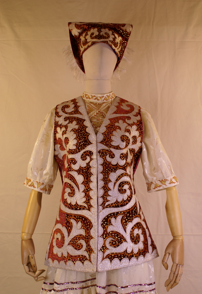 俄羅斯族女性的服飾則更多的體現(xiàn)了女性美,她們?cè)谥卮蠊?jié)慶或節(jié)日時(shí)會(huì)穿上絲綢質(zhì)地的繡花襯衣,外面再套穿一件無(wú)袖、腰身較高的對(duì)襟長(zhǎng)衫,下身一般穿著毛織長(zhǎng)裙。俄羅斯族女子也十分喜愛(ài)穿長(zhǎng)筒皮靴或氈靴。俄羅斯族女性的發(fā)飾也視年齡的不同而有所差異,少女梳獨(dú)辮,把彩色發(fā)帶和小玻璃球編在辮子里,頭發(fā)可外露。已婚婦女則梳兩條辮子,盤(pán)于頭頂,再用頭巾或帽子罩上。