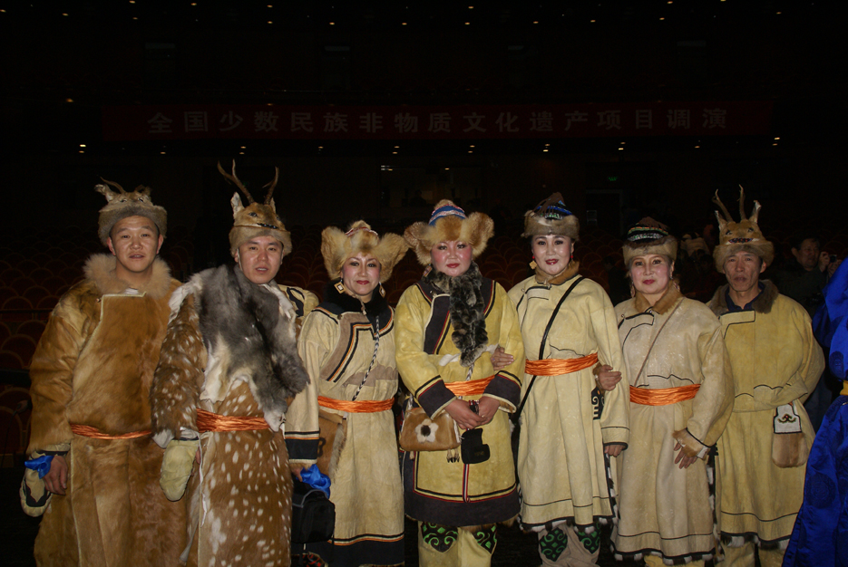 鄂倫春族的傳統(tǒng)服裝以袍式為主,冬季穿“蘇恩”。“蘇恩”是用冬季絨毛狍皮縫制的右任長袍,小立領(lǐng),襟邊、下擺和袖口用黑色皮鑲嵌云卷花紋等邊飾,女袍還要作環(huán)肩裝飾。為便于奔跑和騎馬,“蘇恩”都有開衩,衩口裝飾圖案豐富多彩。夏天穿用夏季沙毛狍皮制作的短袍或坎肩,布匹傳入以后穿布袍。 男子下身穿狍皮短褲,褲腿過膝,樣式如老式免襠褲,后來改穿長褲。出獵時(shí)褲子上面還要穿套褲。套褲無襠,呈筒狀,上角釘有皮條,系在腰帶上。一般用夏季的狍皮縫制,因?yàn)橄募镜尼笃ぐ搴衲湍?,也有用鹿皮縫制的。婦女的褲子樣式比較獨(dú)特,長至腳面,比男褲瘦些,腰兩側(cè)有開衩,前面有兜肚,兜肚頂端釘皮條,系在脖子上。這樣的褲子,既保暖又便于騎馬,可以護(hù)住前心,又起到了乳罩的作用。講究的人還在褲子兩側(cè)和褲腳處繡上花邊圖案。