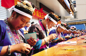 三江縣同樂苗族鄉(xiāng)舉辦刺繡手工限時(shí)賽,繡娘們向游客們展示傳統(tǒng)的少數(shù)民族刺繡技藝