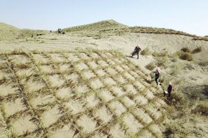 在甘肅省古浪縣北部沙區(qū)旱麻崗治沙點(diǎn),八步沙林場(chǎng)治沙人和群眾一起扎草方格壓沙。 新華社記者 范培珅攝