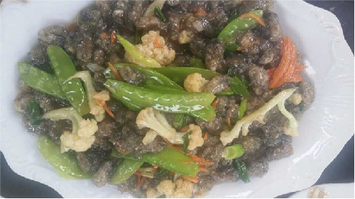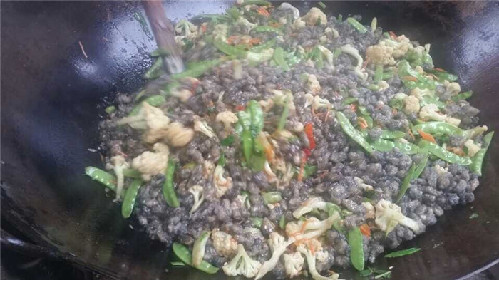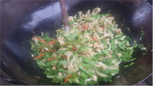 烹制蚵柳,先要挑選好個(gè)肥形大的鮮蚵,用心幾遍洗凈,再用篩細(xì)的地瓜粉薄薄拌勻,務(wù)求每只蚵仔獨(dú)立成團(tuán),再兜在漏勺里到滾開的水里焯一下即起來,再攤放有竹篩簸里晾干瀝水一個(gè)晚上。第二天中午烹制,先把油燒熱,倒入生姜末過油,再依次倒入花菜、荷蘭豆、紅蘿卜絲、芫荽等“菜腳”與鹽、雞粉、料酒、蠔油、胡椒粉、醋等佐料一并翻炒,菜蔬生汁,試嘗咸淡,再倒入已備好的蚵仔團(tuán)翻炒,只需幾下,便已熟透,即可裝盤。