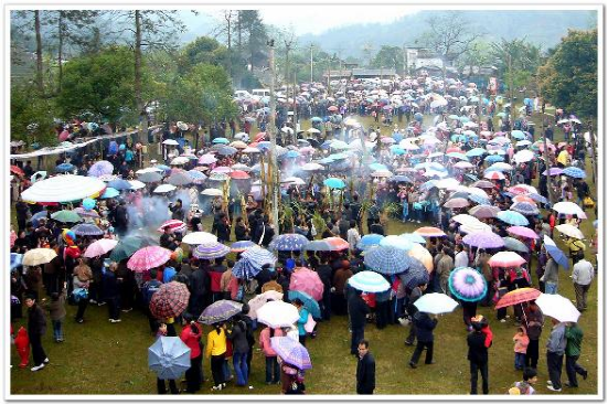 廣西融水縣的香粉古龍坡會于每年農(nóng)歷正月十六舉行,所以又名“十六”坡。這一天、來自外國朋友、各地的游客及當(dāng)?shù)胤綀A十里的苗哥苗妹,提蘆笙,提鳥籠、牽馬匹,打花傘……朝著十六坡趕來。正午時分,山梁上、村道間、河溪旁,出現(xiàn)了成列成隊穿紅戴綠的人群。遠(yuǎn)遠(yuǎn)望去,似一條彩帶在飄動。當(dāng)萬余人江集后,整個坡地就成了彩色的世界。