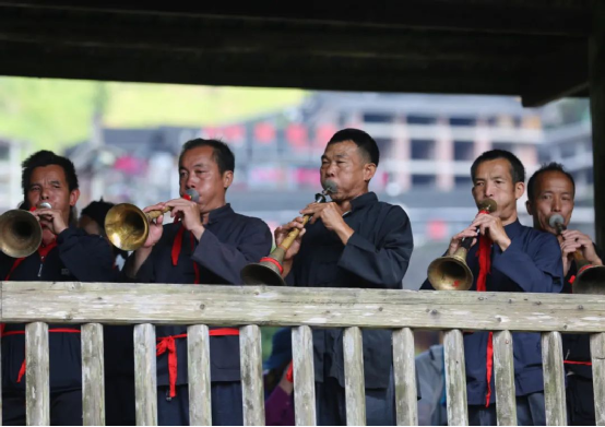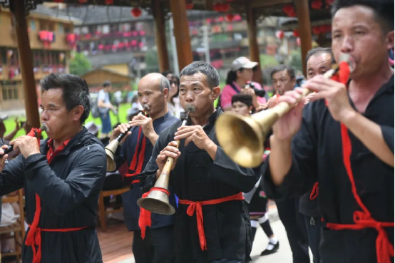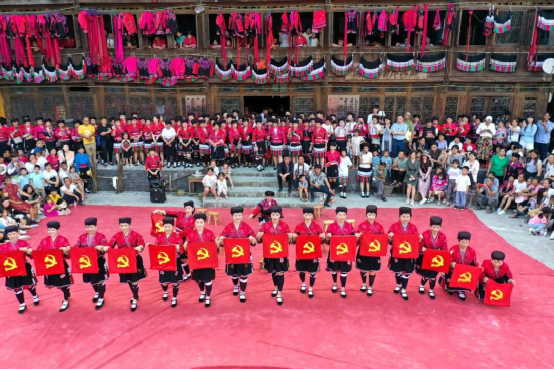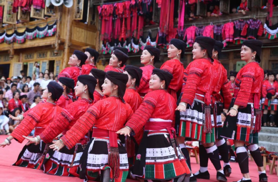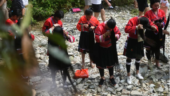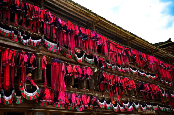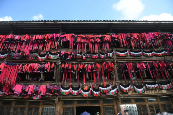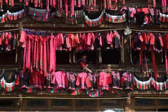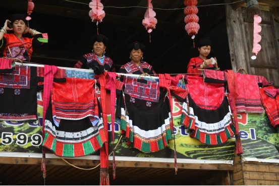 這一天,寨子里賓客盈門熱鬧異常,嫁出去的女兒和在外寨入贅的兒子都要挑著鴨子、酒和禮品,背著小孩回家吃團(tuán)圓飯,家家戶戶包粽子過大節(jié)。紅瑤姑娘和嫂子們,紛紛推開窗戶,拿出民族盛裝一件件掛在窗外晾曬,整個(gè)寨子掛滿了紅衣服,顯得格外鮮艷奪目。