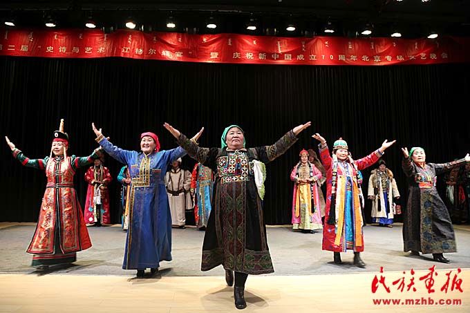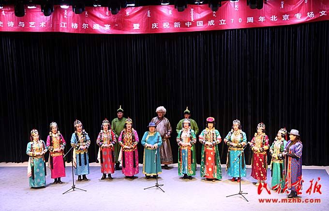 2019年11月11日,第二屆“史詩(shī)與藝術(shù):江格爾盛宴(論壇)”暨慶祝新中國(guó)成立70周年北京專場(chǎng)文藝晚會(huì)在北京民族文化交流中心魚(yú)與劇場(chǎng)舉行。晚會(huì)分為新疆蒙古族服飾表演、民歌、史詩(shī)、民俗表演4個(gè)單元,來(lái)自新疆阿勒泰、塔城、博爾塔拉、巴音郭楞等地州的105名民間藝人為首都觀眾獻(xiàn)上了一場(chǎng)原生態(tài)視聽(tīng)盛宴。