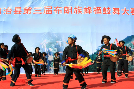 蜂桶鼓舞是布朗族的群眾性舞蹈,分為三步和五步兩種。演出時,由兩名年輕男女雙手各持一條“帕節(jié)”(即毛巾)在前面跳“帕節(jié)舞”引導(dǎo),舞蹈動作主要是甩手巾。其后是蜂桶鼓隊,一般為4—6只,后緊隨2只象腳鼓,之后是6人敲打的大、中、小芒和镲,最后是跟著跳舞的人們和助興的老幼。蜂桶鼓舞的節(jié)奏明快熱烈,幾種打擊樂器相配合,“嘣咚、嘣咚……嘭嚓、嘭嚓……鏘切、鏘切……”,高、中、低音融為一體,獨具情趣。動作大方、瀟灑、粗獷、活潑;舞姿輕盈、柔和、細(xì)膩。大南直布朗蜂桶鼓隊多次被邀赴省城和省外演出,向人們展示了本民族獨特的文化藝術(shù)風(fēng)采。