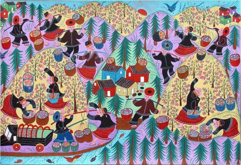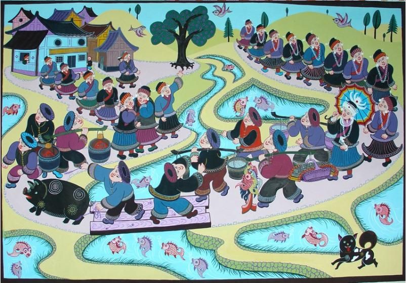 劍河現(xiàn)代民間繪畫源于傳統(tǒng)的苗族刺繡文化,是苗族刺繡文化的另一種表現(xiàn)形式和藝術(shù)升華。傳統(tǒng)的苗族文化多以服飾、歌舞為載體,并以刺繡及演唱等形式進(jìn)行表現(xiàn)和傳承。早期劍河現(xiàn)代民間畫即脫胎于具有適用性的苗族刺繡樣稿——剪紙和手繪刺繡粉本,換言之,手繪的苗族刺繡粉本便是劍河現(xiàn)代民間繪畫的雛形,劍河第一批優(yōu)秀的現(xiàn)代民間畫作者,即是原當(dāng)?shù)厥掷L粉本的能工巧匠。劍河現(xiàn)代民間繪畫多以苗族神話傳說中的故事情節(jié)和民俗節(jié)日、生產(chǎn)活動等內(nèi)容為題材入畫,素材涵蓋自然界花鳥蟲魚及人物、家畜等具體形象,造型稚拙天真,設(shè)色濃艷,對比強(qiáng)烈。作品傳達(dá)出典型的地域民俗氣息及濃厚的鄉(xiāng)土味,便是其標(biāo)志性特征。