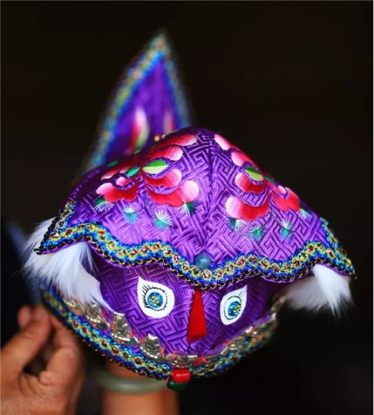 走進楊文煥的工作室,猶如進入一個明媚鮮艷的夢境。首先映入眼簾的,便是那一頂頂色彩鮮艷、繡工精致的童帽:造型大方、線條流暢的獅子帽;色彩明艷、虎虎生威的老虎帽;精巧別致、活潑可愛的翹尾帽;高雅富麗、古韻悠長的公子帽;別具一格、特色鮮明的牌坊帽。